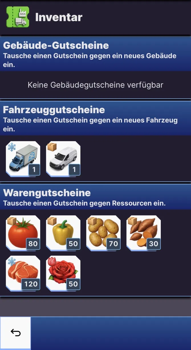 🏷️ Manchmal erhältst du Waren, Gebäude oder Fahrzeuge als Belohnung für Aufgaben oder als Teil eines Shop-Pakets. Diese werden als Gutscheine in dein Inventar gesendet.