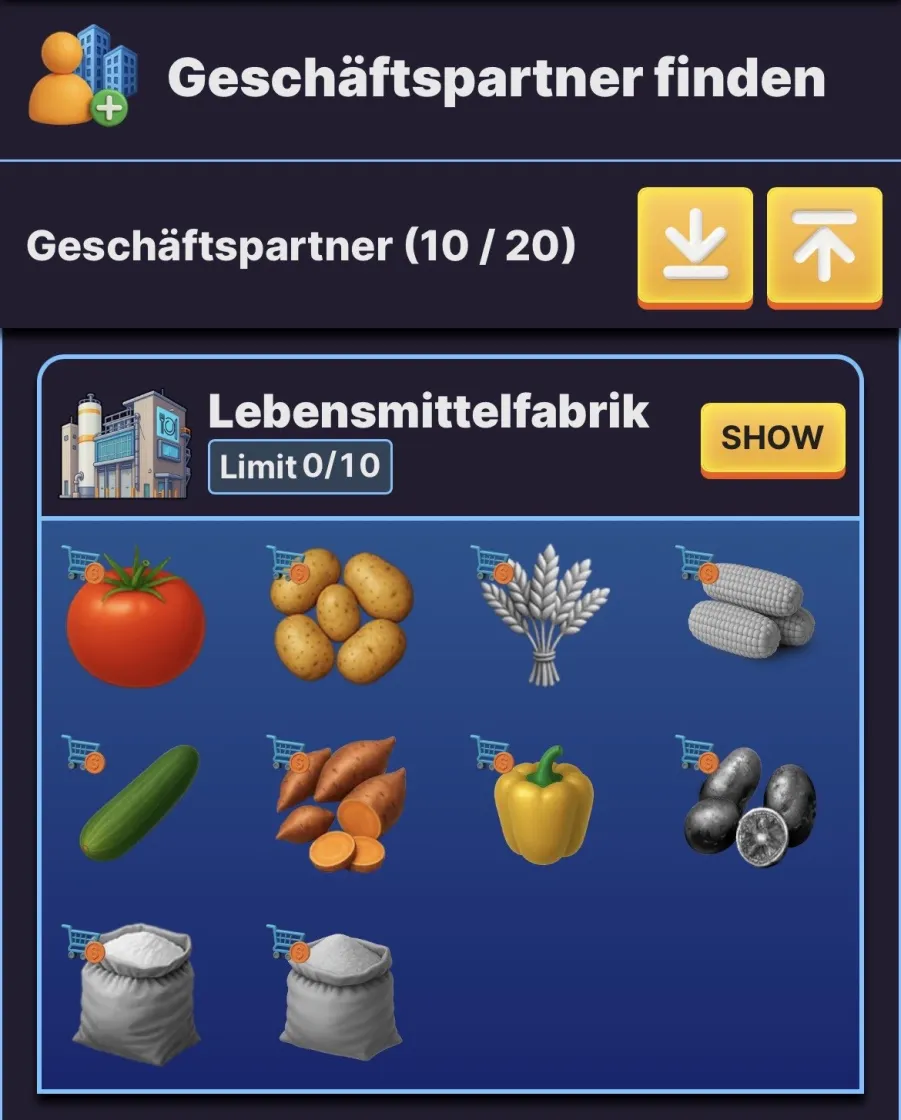 - WĂ€hle den gewĂŒnschten GeschĂ€ftspartner-Typ aus. Je nach Art deines GeschĂ€ftspartners werden unterschiedliche Waren von diesem angefordert. WĂ€hle daher die GeschĂ€ftspartner, die Waren benötigen, die du bereitstellen kannst, und klicke auf âshowâ.