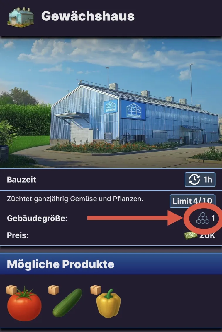 Wenn du ein GebĂ€ude platzieren möchtest, wirst du vielleicht bemerken, dass in der Detailansicht eine GebĂ€udegröĂe angegeben ist: