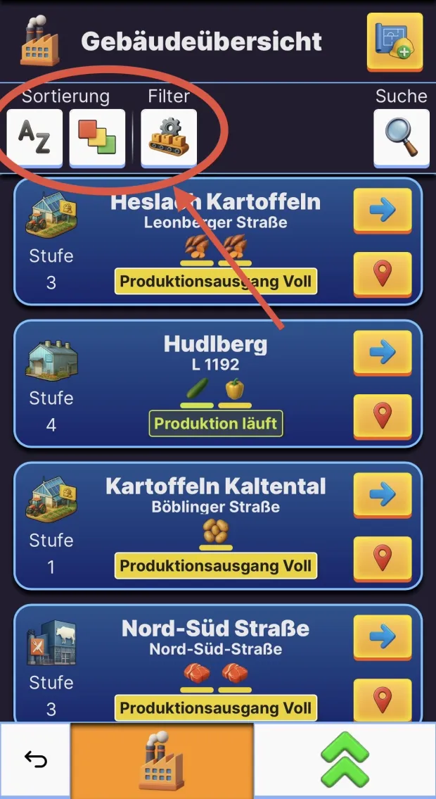 • In der GebĂ€udeĂŒbersicht siehst du alle GebĂ€ude, die du gebaut hast. Du kannst die Liste mit den verfĂŒgbaren Filteroptionen anpassen.