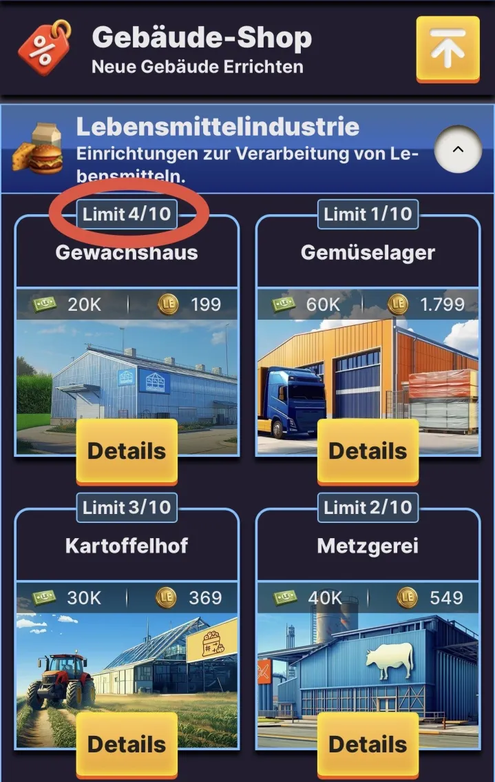 • Die Limits für jeden Gebäudetyp sind über jedem Gebäude im Gebäude-Shop angegeben.