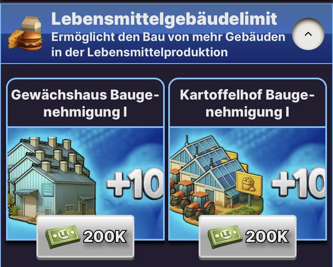 Du kannst nur eine begrenzte Anzahl von Gebäuden desselben Typs besitzen. Sobald du das Limit erreicht hast, kannst du keine weiteren Gebäude des ausgewählten Typs platzieren.