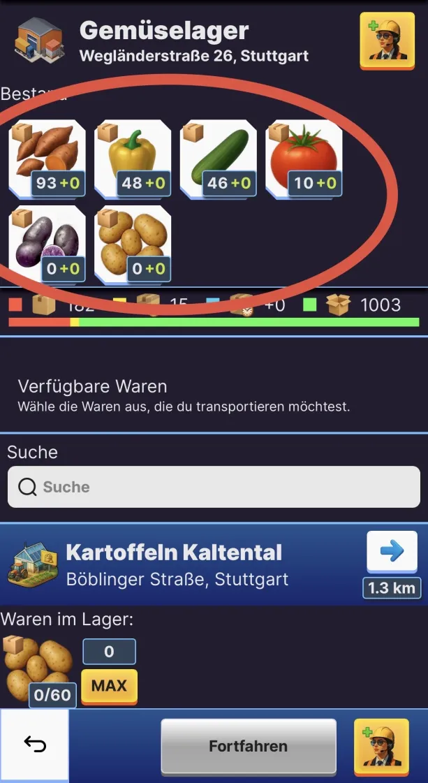 Du kannst Waren nur an ein Gebäude senden, welches diese Ware für die Produktion benötigt oder ein Lagerhaus ist, in dem die Waren gelagert werden können. Zum Beispiel können im Gemüselager sämtliche Gemüsesorten gelagert werden, jedoch keine Waren die gekühlt werden müssen, wie beispielsweise Fleisch.