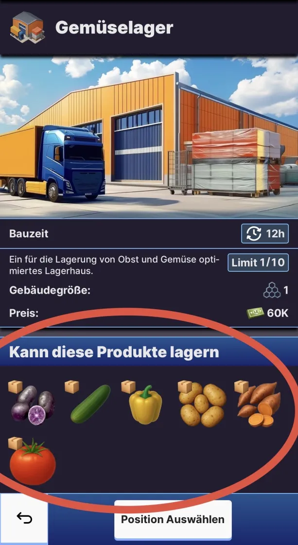 - Wenn du versuchst, ein Lagerhaus zu kaufen, kannst du sehen, welche Waren es lagern kann: