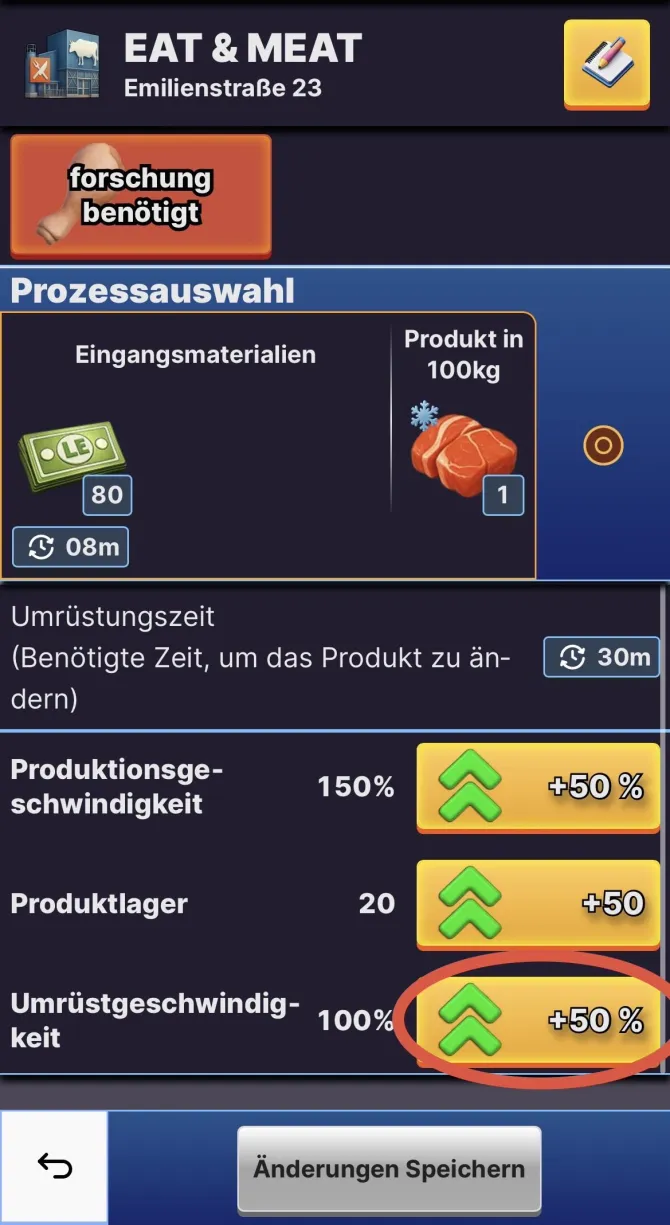 1. Um die Umrüstzeit zu verkürzen, navigiere zur Gebäudeübersicht eines Produktionsgebäudes und klicke auf die Schaltfläche „Produktionslinieneinstellungen“: