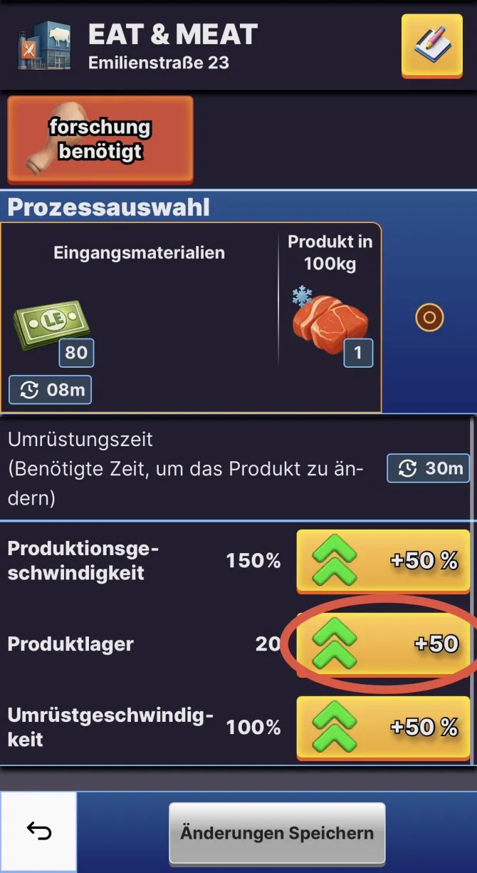 1. Um das Lager zu erweitern, navigiere zur Gebäudeübersicht eines Produktionsgebäudes und klicke dann auf die Schaltfläche „Einstellung“: