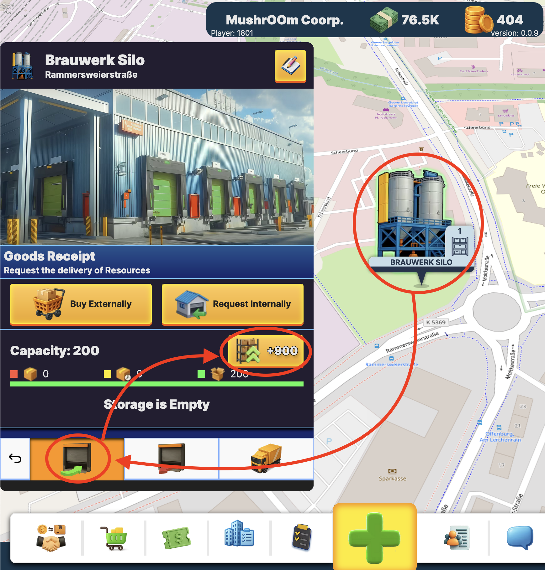 Um den Lagerraum zu erweitern, navigiere zum Versandbereich in deinem Gebäude und erweitere ihn durch Klicken auf die Schaltfläche „Lagerraum erweitern”.