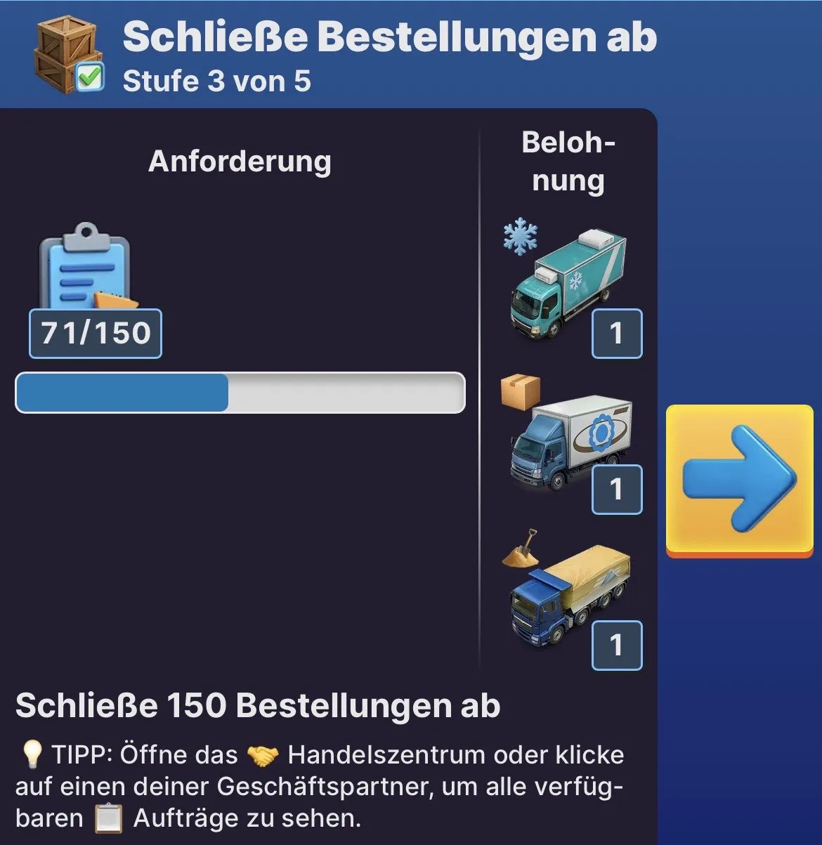 - Die Beschreibung jeder Aufgabe sagt dir, was du tun musst (z. B. Bestellungen abschließen).