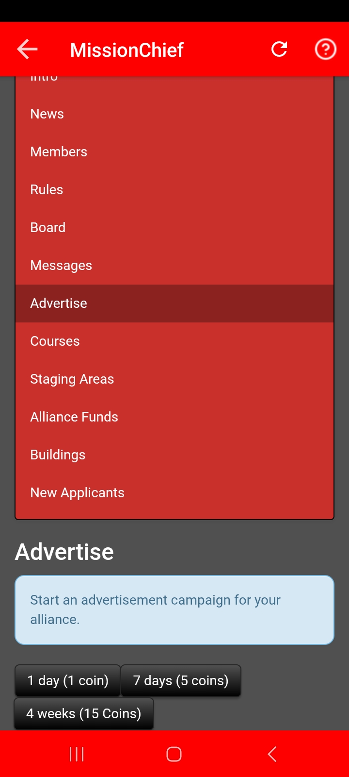 If you’re already in an alliance, you can indicate that you’re looking for new members by advertising your alliance. This will highlight your alliance in green in both the list and the alliance finder.