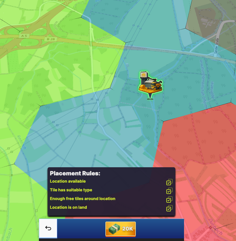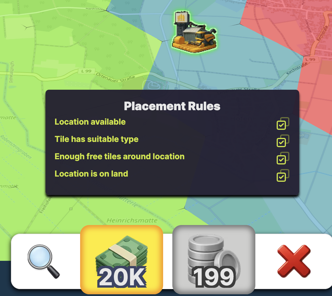 - Search for a suitable building site and place your building. You need to find a green marked hex-field to build your building. If the field is red it is blocked by another building. Is the field grey, your building is not allowed here. Blue fields mark the space your building will occupy if it is placed here.