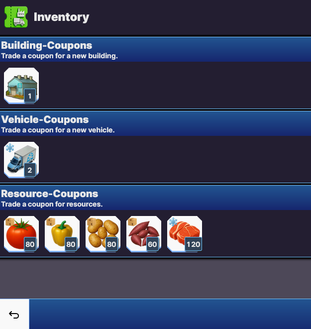 🏷️ Sometimes you will get goods, buildings or vehicles as a reward for completing tasks or as part of a shop bundle. You receive those as coupons and they get sent to your inventory.