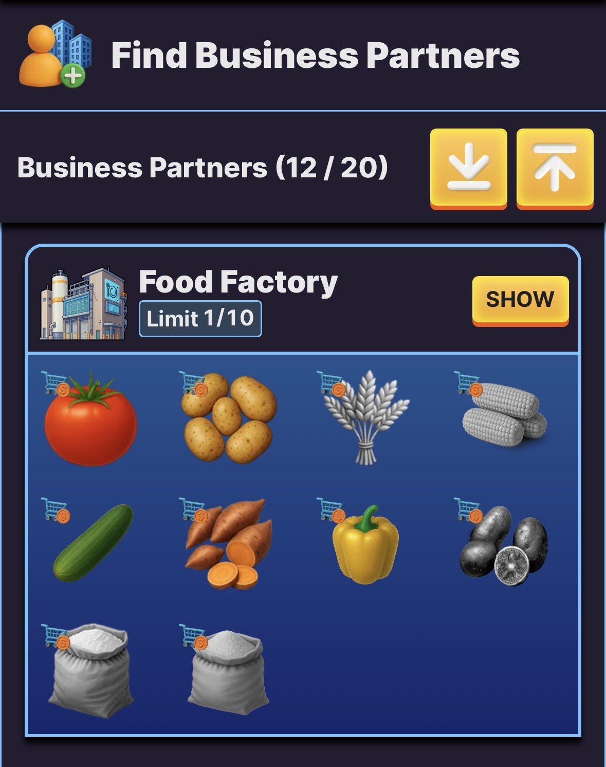 - Based on the type of your business partner, they will demand different goods of you. So choose the business partners that may demand goods you can produce and click on "show".