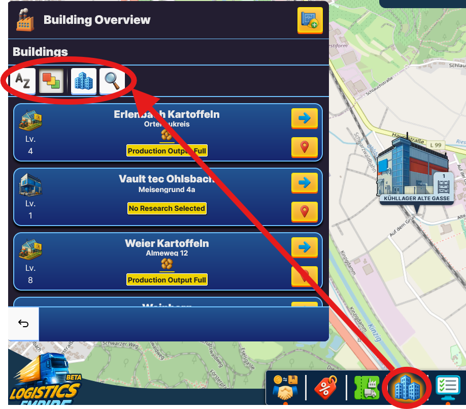 - In the building overview you can see all buildings you have built. You can adjust the list with the available filter options.