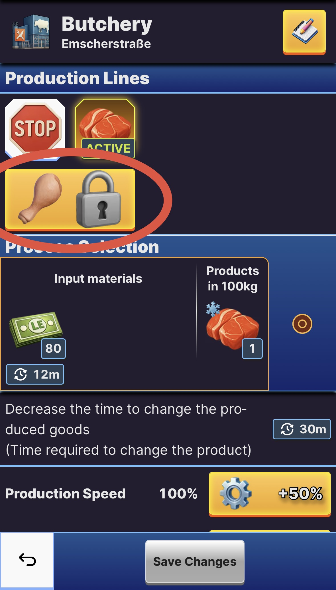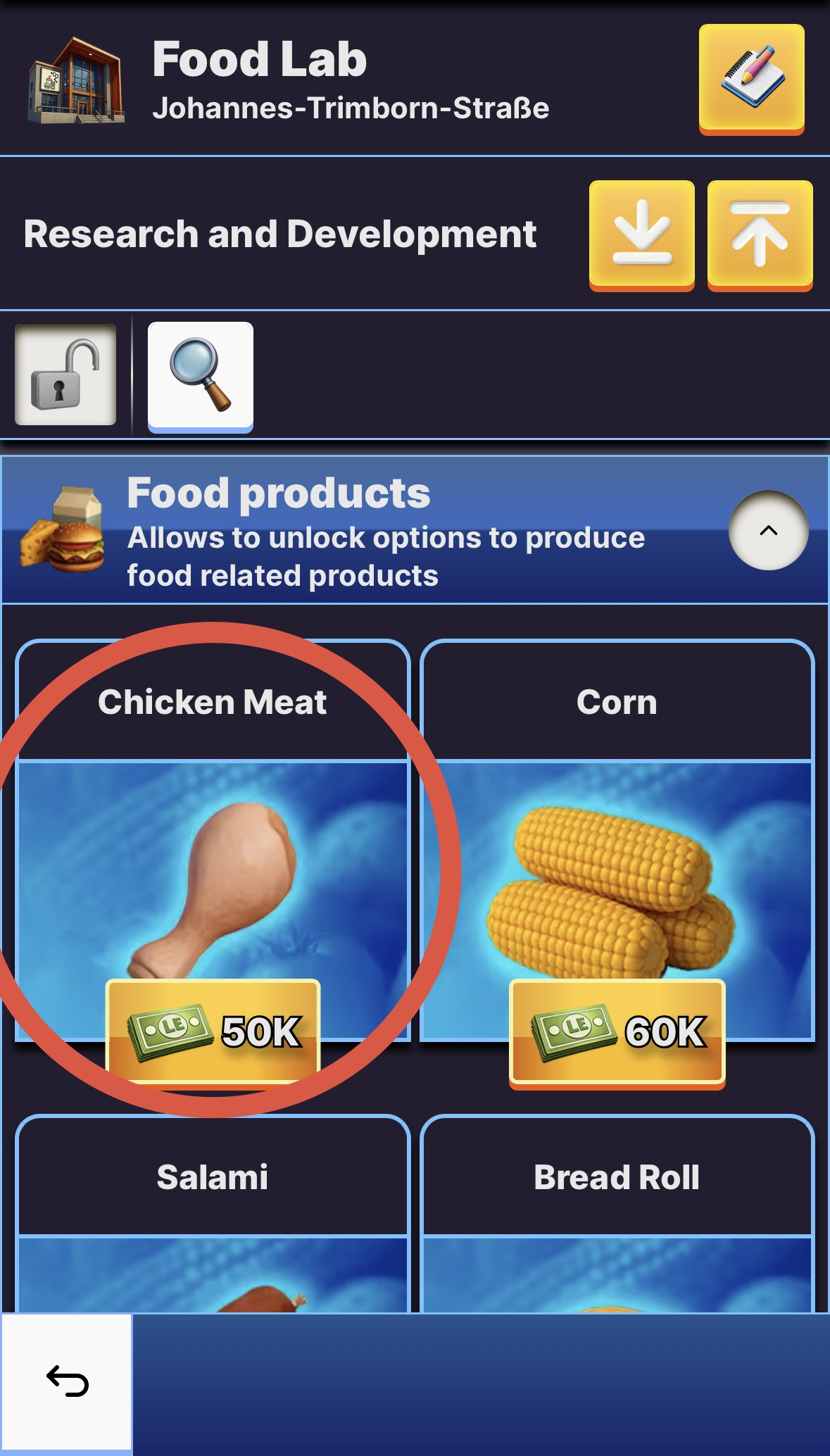 • Navigate to the building you want to unlock the goods. For example, if you just researched chicken meat, then you now have to go to a Butchery.