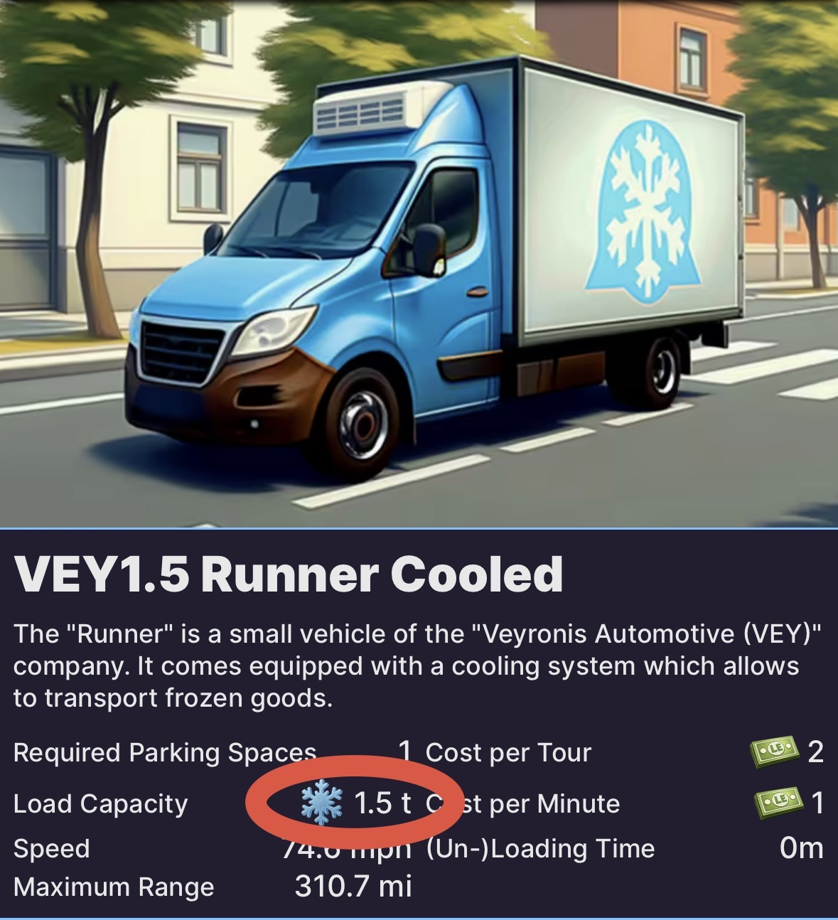 Click on a vehicle in a building to open its vehicle details. The Icon next to the load capacity shows what goods typ the vehicle can transport, in this case cooled goods.