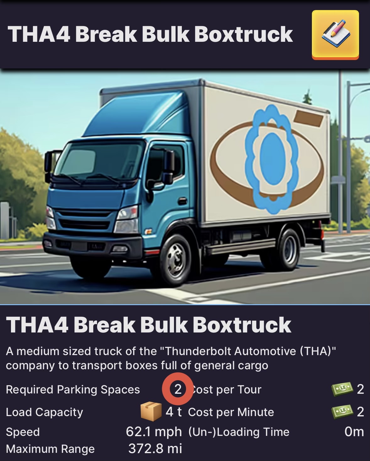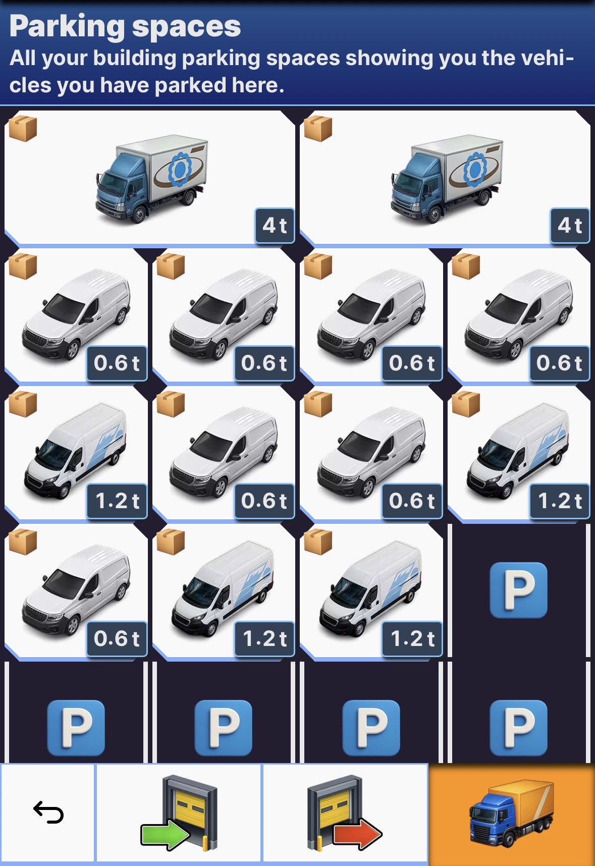 You can see the required parking space in the vehicle details or in your building, if you bought the vehicle already. This number shows you how much parking space the vehicle will occupy in a building.