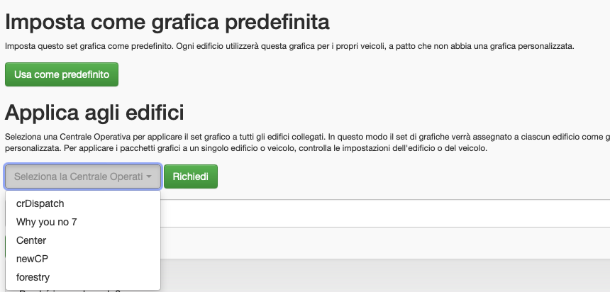 Clicca su “Mostra” accanto a un set per visualizzare tutte le grafiche dei veicoli contenute. Puoi impostare un set come predefinito affinché tutti i tuoi veicoli lo utilizzino. Puoi anche applicarlo a un punto di risposta specifico selezionandolo dal menu a tendina. Questo permette ai tuoi veicoli di mostrare design tipici della regione coperta da quel punto di risposta.