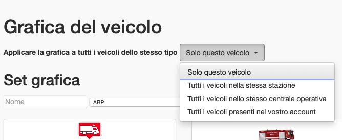 Nelle impostazioni dei veicoli puoi persino scegliere grafiche per i singoli veicoli. Quando selezioni un design per un veicolo, puoi anche applicarlo a tutti i veicoli dello stesso tipo nella stessa stazione, nello stesso punto di risposta, oppure globalmente.