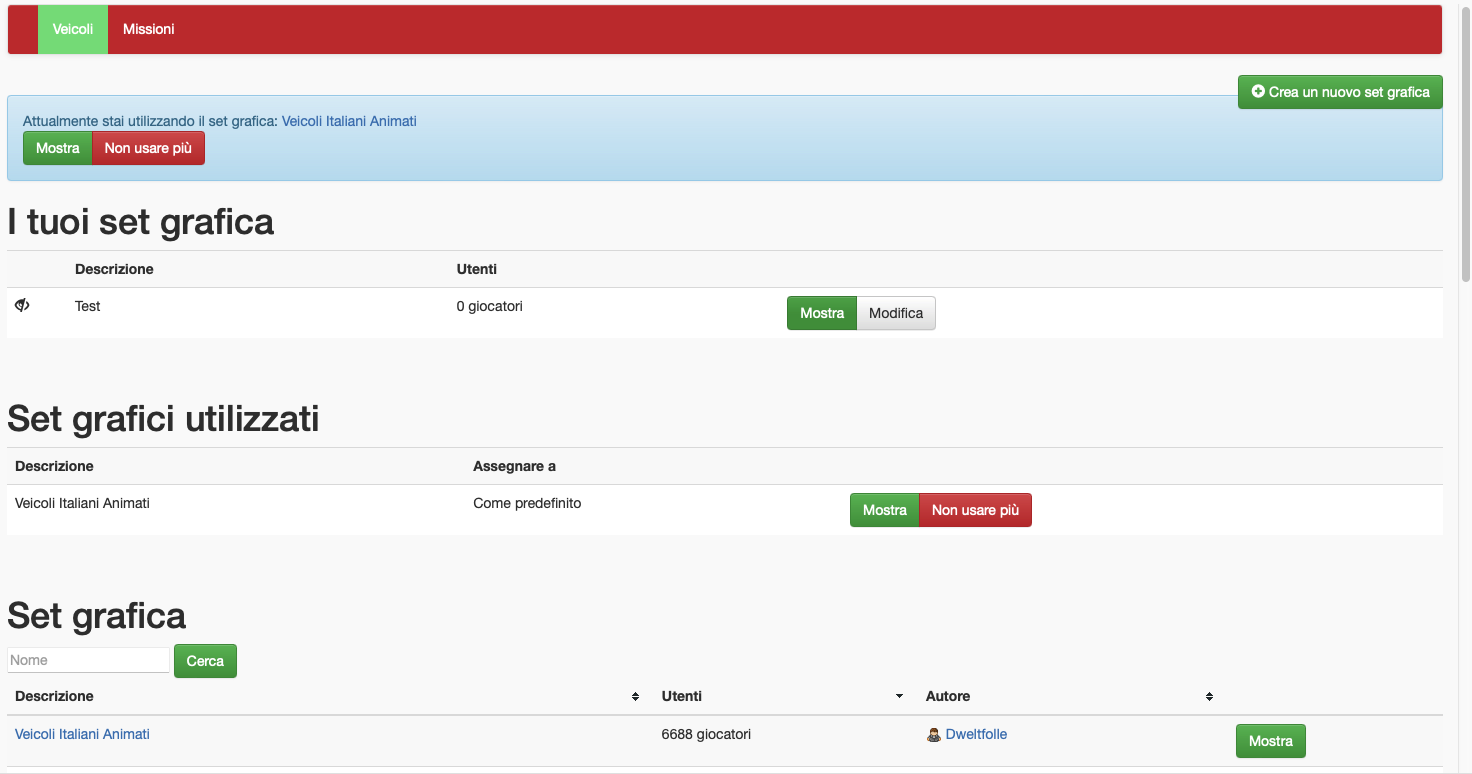 Puoi accedere ai set grafica tramite la sezione profilo del menu. Nella scheda veicoli troverai l’elenco di tutti i set grafica caricati da altri giocatori.