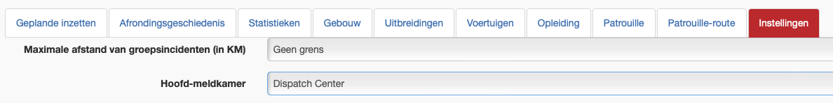 Je kunt elke meldkamer instellen als hoofd-meldkamer via het keuzemenu bovenaan het tabblad Instellingen in het Meldkamer-menu.