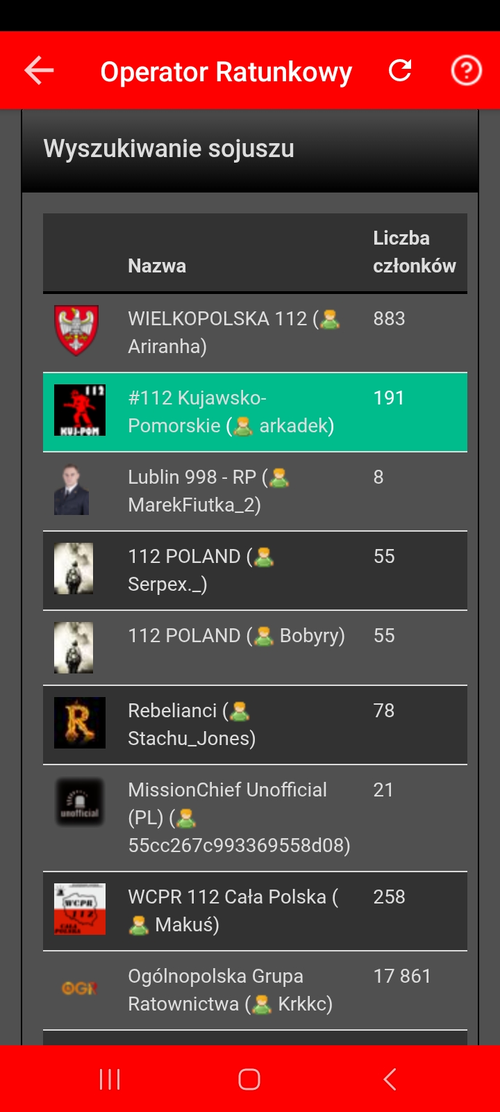 Wyszukiwanie sojuszu sprawdza graczy, którzy byli aktywni w ciągu ostatnich 24 godzin i mają Centum powiadamiania w tym obszarze, i wyświetla ich sojusze – maksymalnie 30 sojuszy wraz z liczbą członków.
